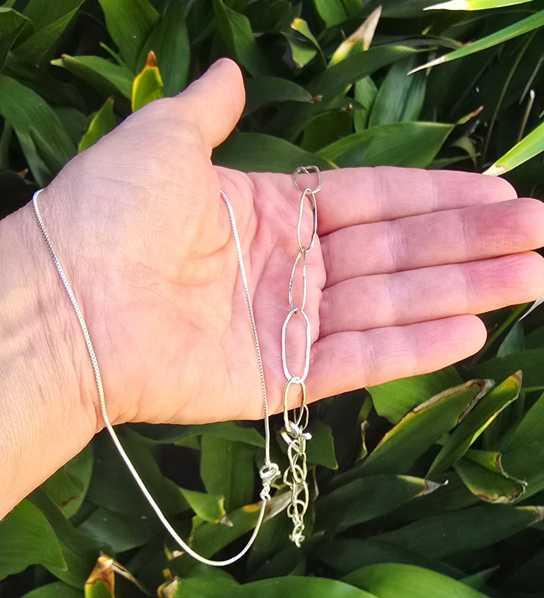 Delicate yet strong, this sterling silver chain adds a refined touch to any piece. At 16 inches, it rests beautifully at the collarbone, ready to carry your story — whether worn alone or with one of our hand-textured pendants. Finished with a sturdy lobster clasp for ease and comfort.