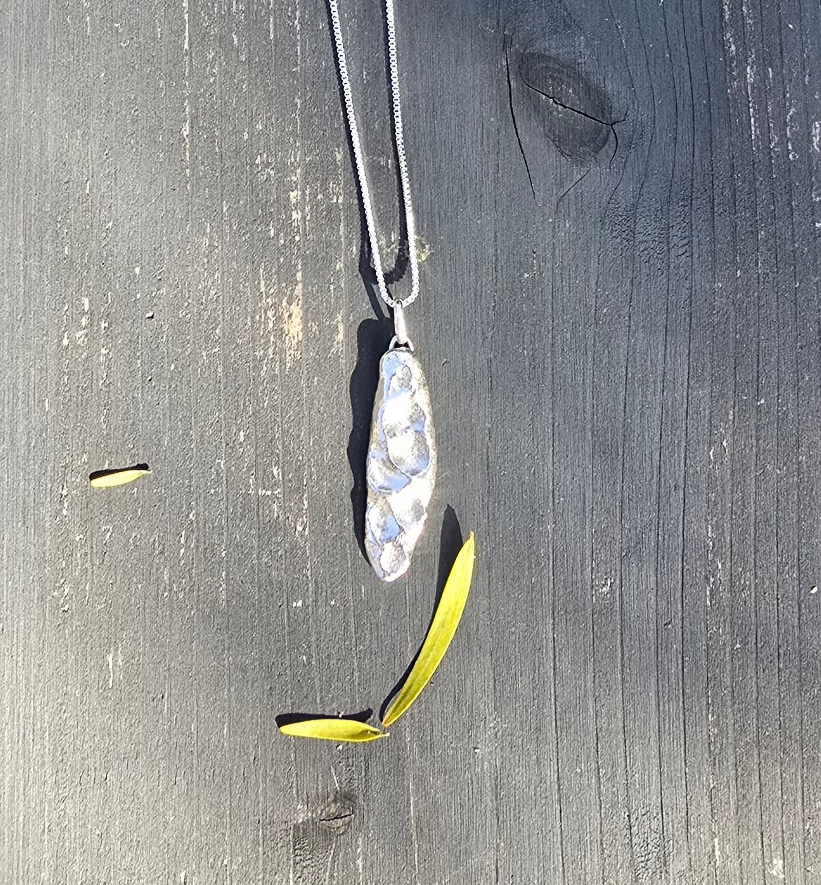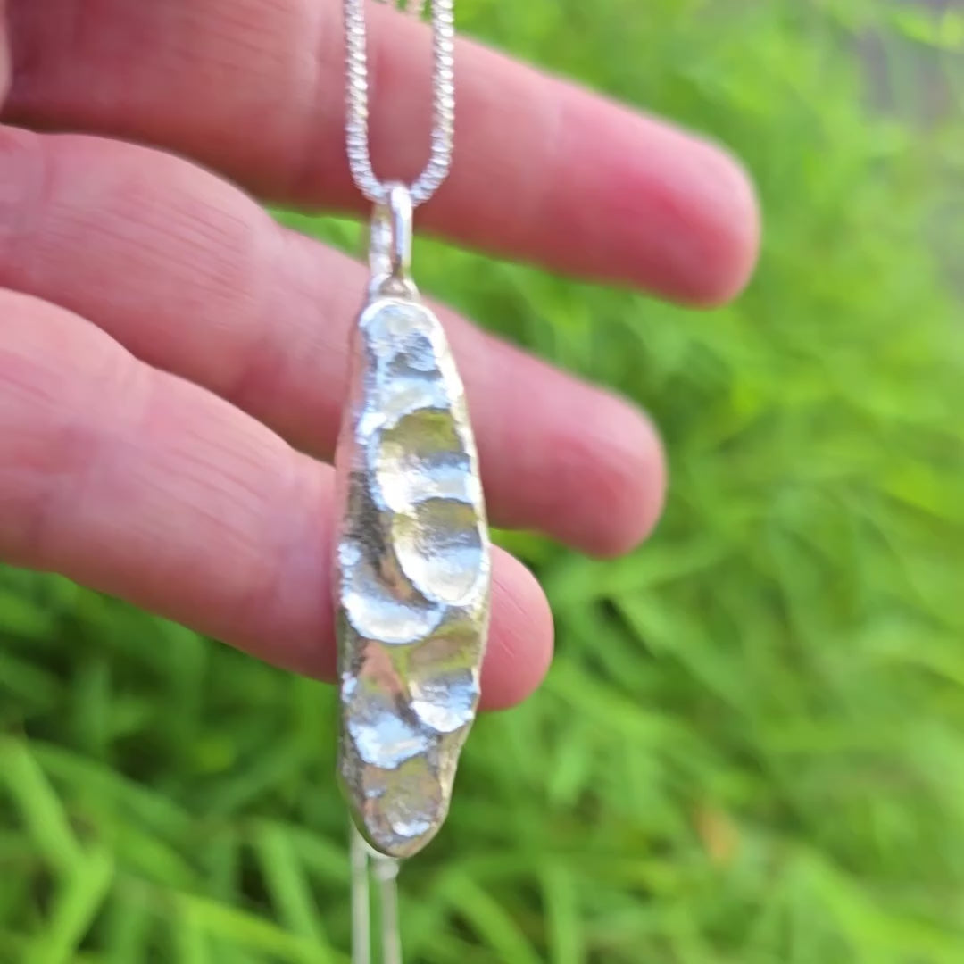 Handmade sterling silver pendant, created by melting solid silver into an organic, freeform shape. The molten surface has natural depth and texture, making this piece a wearable sculpture.