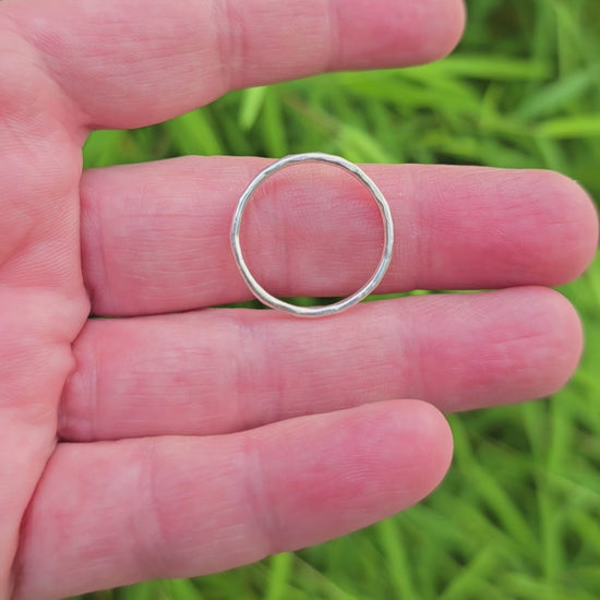 A timeless sterling silver band with an organic hammered finish. Each ring is shaped, textured, and polished by hand, giving it subtle facets that catch the light. Perfect to wear on its own, stacked with others, or paired with statement rings from the Raw Grace Collection.