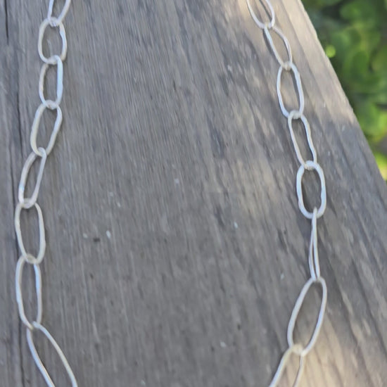 This 18-inch chain is handmade from solid sterling silver wire, each elongated link shaped and hammered by hand. The organic texture and irregular oval forms give it a raw, earthy elegance that pairs beautifully with pendants or makes a striking statement on its own.